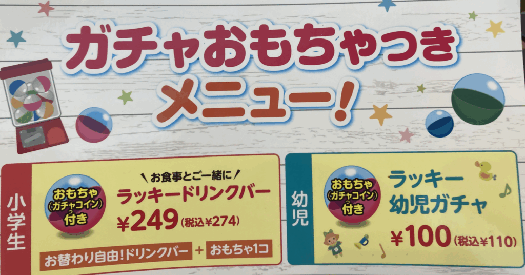 - 幼児向けガチャ(100円):会計まわりに設置。今回は内容(ミニおもちゃ)を確認し、“最後に一つ遊びを残す”演出として使いやすい印象。食後の機嫌が安定します。