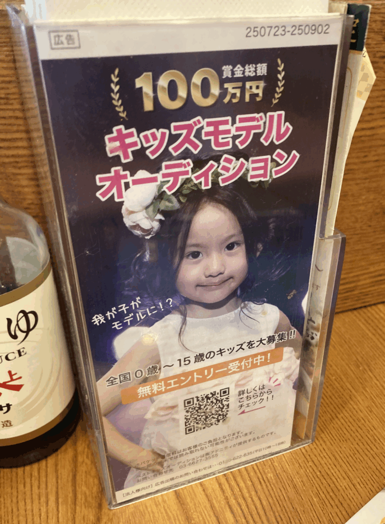 - 「キッズモデルオーディション」掲示:店内紙ナプキン入れで視認。家族客へのコミュニケーションが太い点を再確認できました。