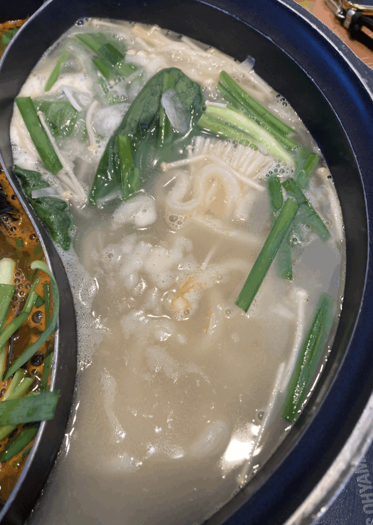 娘(1歳)は、白だし側にうどんと野菜を少量、というのが定番ですが、今回は鍋の様子見を優先し、大人の取り分けに合わせて“味薄めの参鶏湯”を運用。写真は“取り分けた後にお湯を加えたもの”を記録しております。