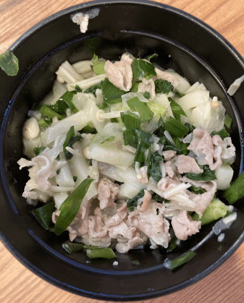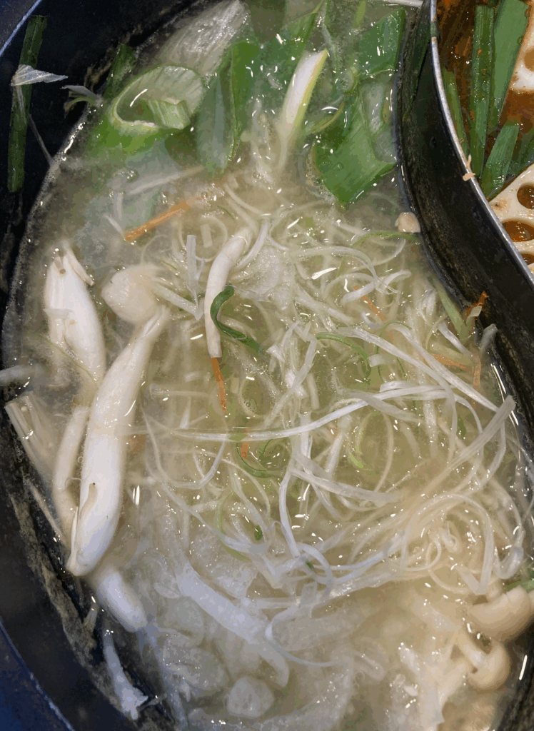 - 1皿目:参鶏湯で軽くスタート(薄切り肉を短時間で泳がせ、だしを濁らせ過ぎない)