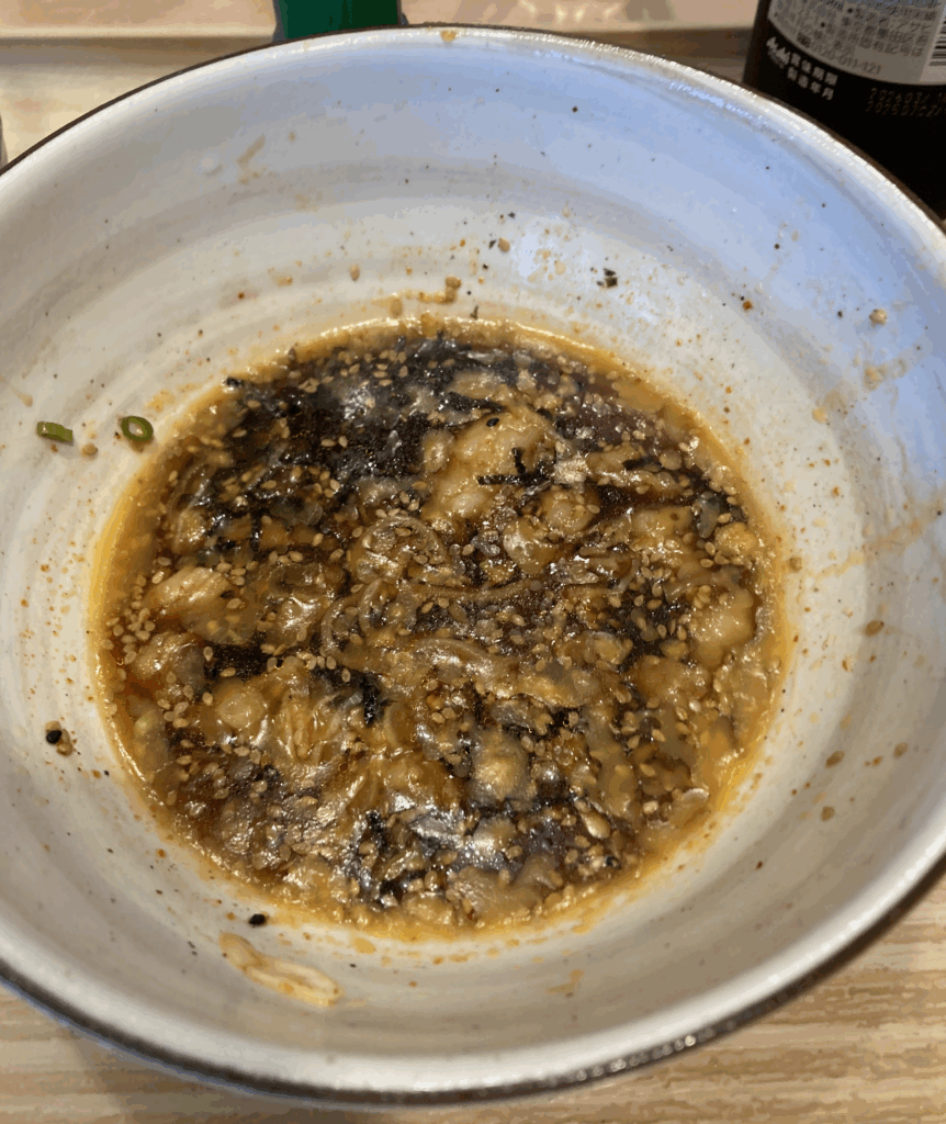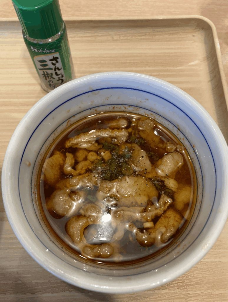 つけ汁がやや少なくなったところで、蕎麦つゆを追加。これにより、和風だしの旨みが新たに加わり、牛もつスープ × そばつゆというハイブリッドな味わいが完成しました。