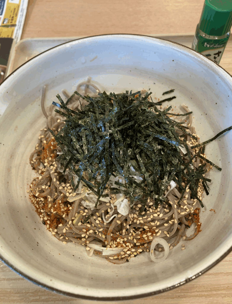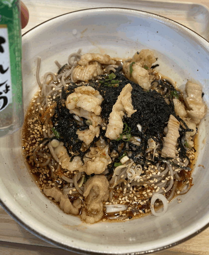 最初のひと口をすすると、ぷるんとした牛もつの旨みが辛みと重なり合い、そば全体に濃厚な風味を与えてくれる。胡麻の香ばしさと、海苔の磯の風味がさらに複雑な層をつくり、ただ辛いだけでは終わらない、奥行きある味わいに仕上がっています。