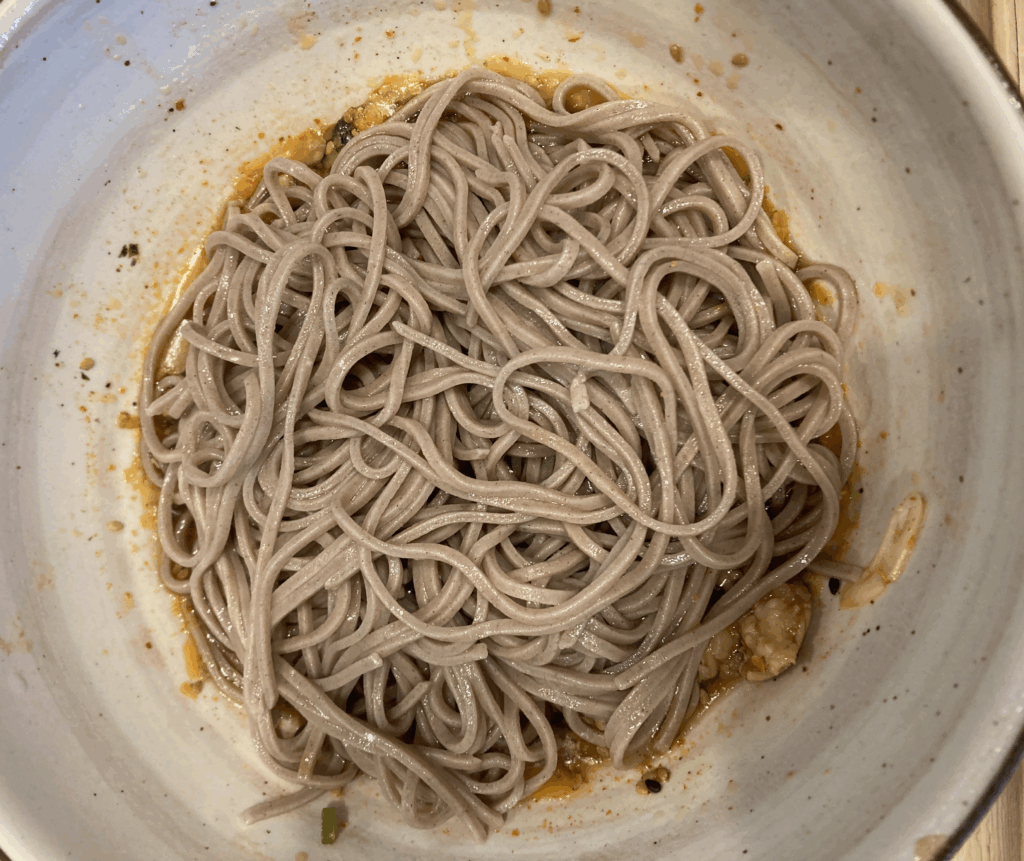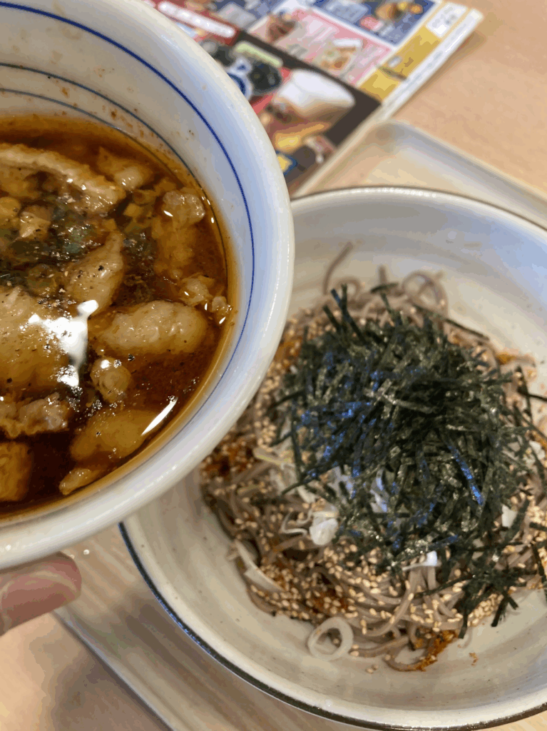 残ったつけ汁にそばを投入するーいわば「替え玉」スタイル。牛もつの旨みが沁みこんだつけ汁が、冷たいそばを再び受け入れ、違う表情を見せてくれます。
