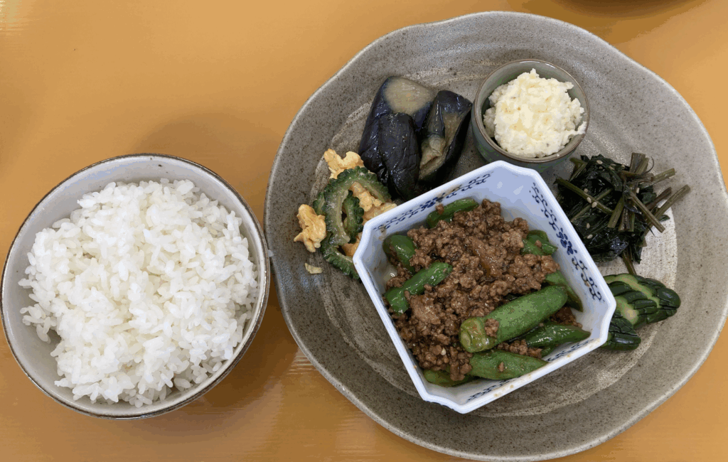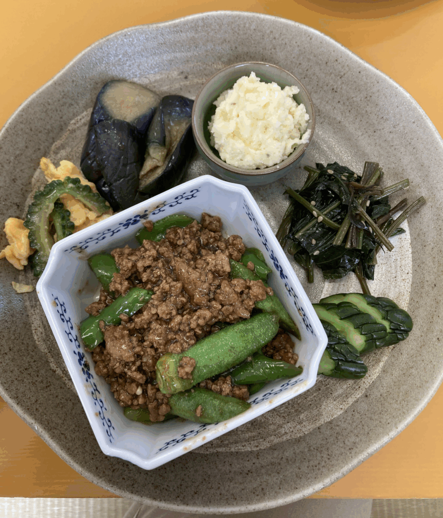 - Aセット:オクラと挽肉の小鉢+副菜群(ゴーヤ卵和え、茄子の煮浸し、ポテトサラダ、ぬめり系青菜、きゅうりの漬物)