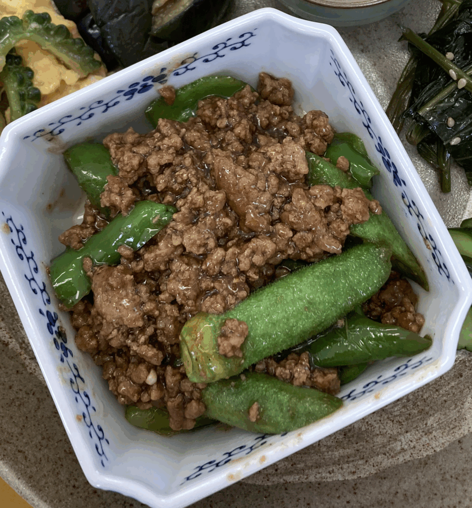 中心の小鉢は、オクラの粘りと挽肉の旨味で満足度を出す「家庭的な一皿」。調理は油で炒めたそぼろを醤油ベースで整え、オクラと軽く合わせた印象です。香りは甘辛よりも“旨味先行”のバランスで、米やパンどちらにも寄せられる懐の広さがあります。