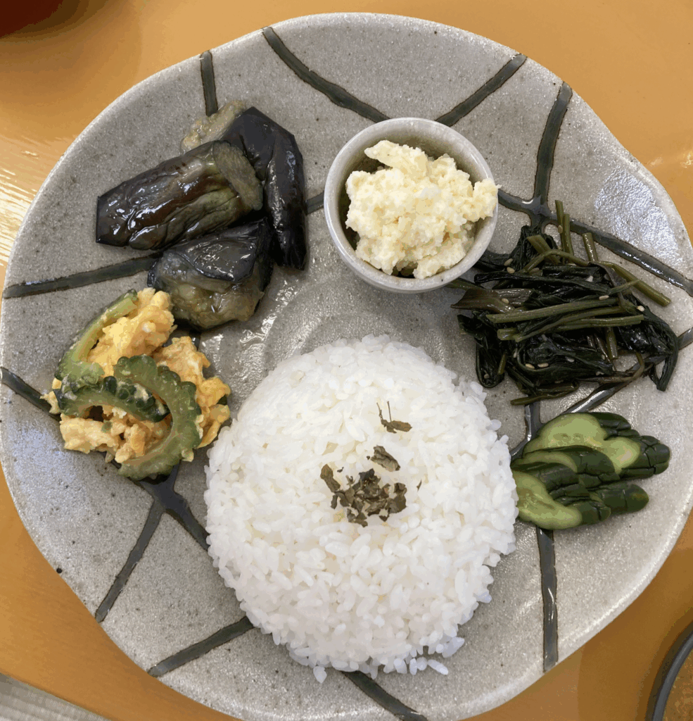 - 右側:緑色の葉物の和え物(ぬめりある葉野菜、つるむらさき系)