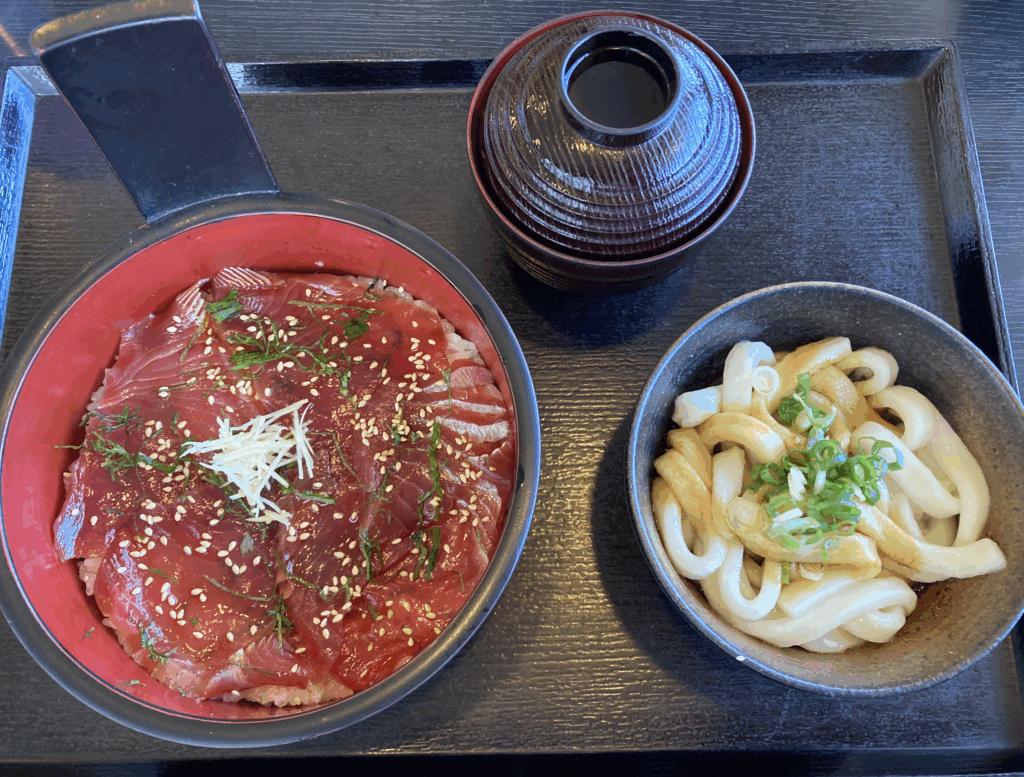 錦屋さんの手こね寿司は「赤身の旨味を丁寧に引き出した漬けの丼」として完成度が高く、ミニ伊勢うどんは地域性の強い太麺と甘めのタレを手早く体験させてくれるセットでした。
