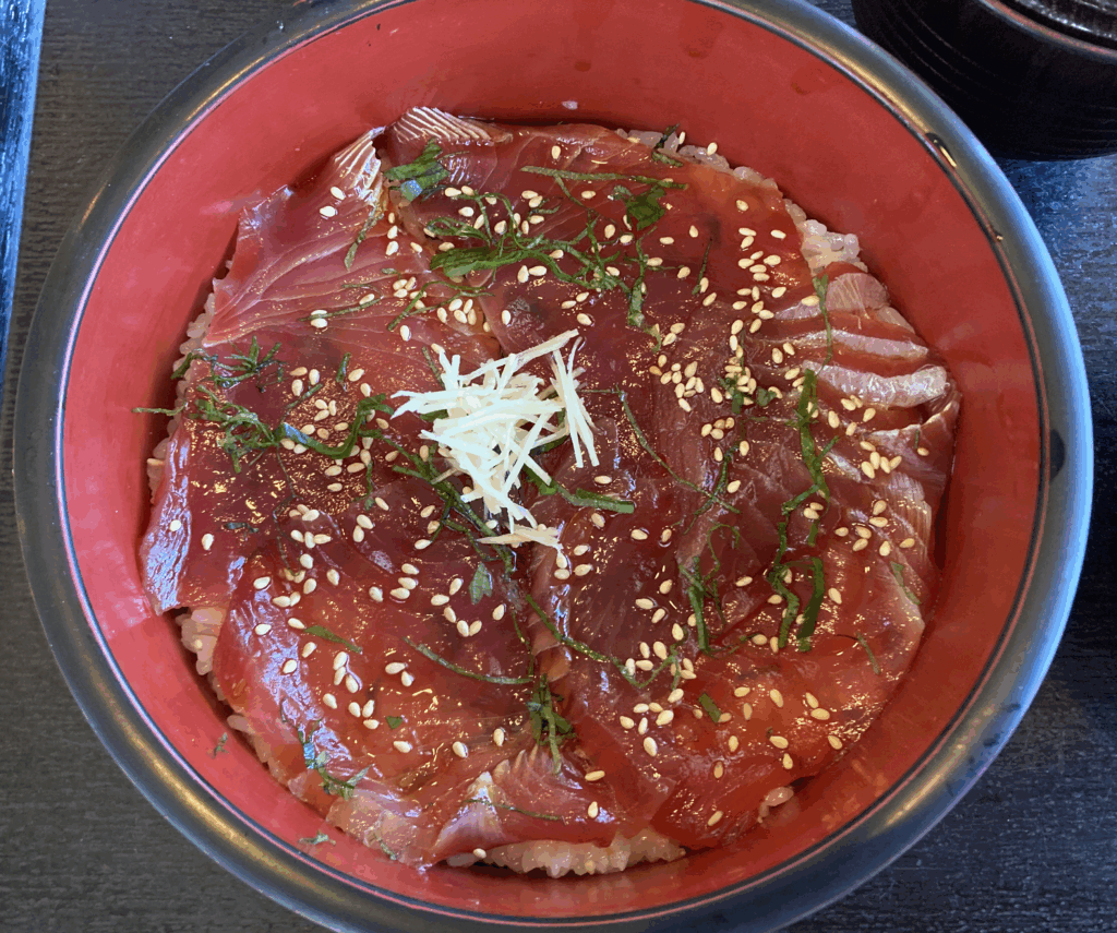 手こね寿司の丼は、赤身主体に醤油ベースの漬けだれ(甘めに整えられていることが多い)をまとった切り身が、しっかりと美しく並べられて出てきます。写真のとおり、色つやの良い切り身がご飯を覆い、白ゴマと生姜・大葉がアクセントとして散らされているため、まず視覚から海の香りが立ち上がってきます。