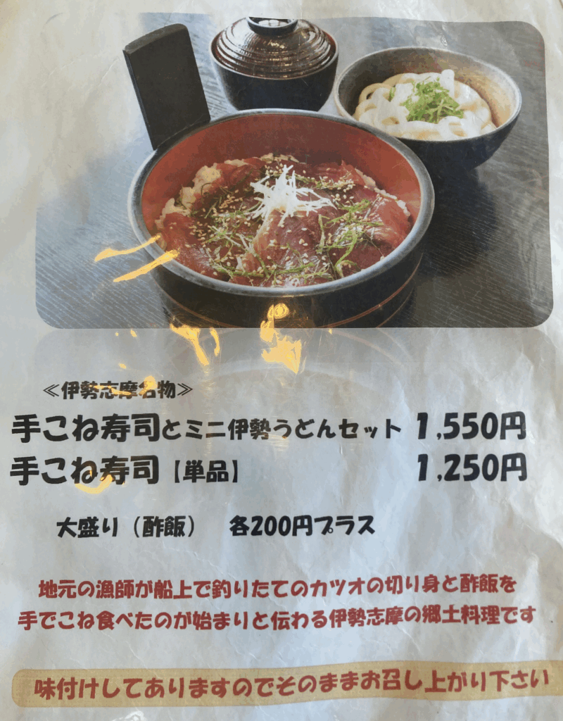 - 食べ合わせ:手こね寿司のさっぱりとした酸味(酢めし)と、伊勢うどんの甘濃いタレのコントラストが鮮やか。交互に口に運ぶことで、それぞれの良さが引き立ちます。