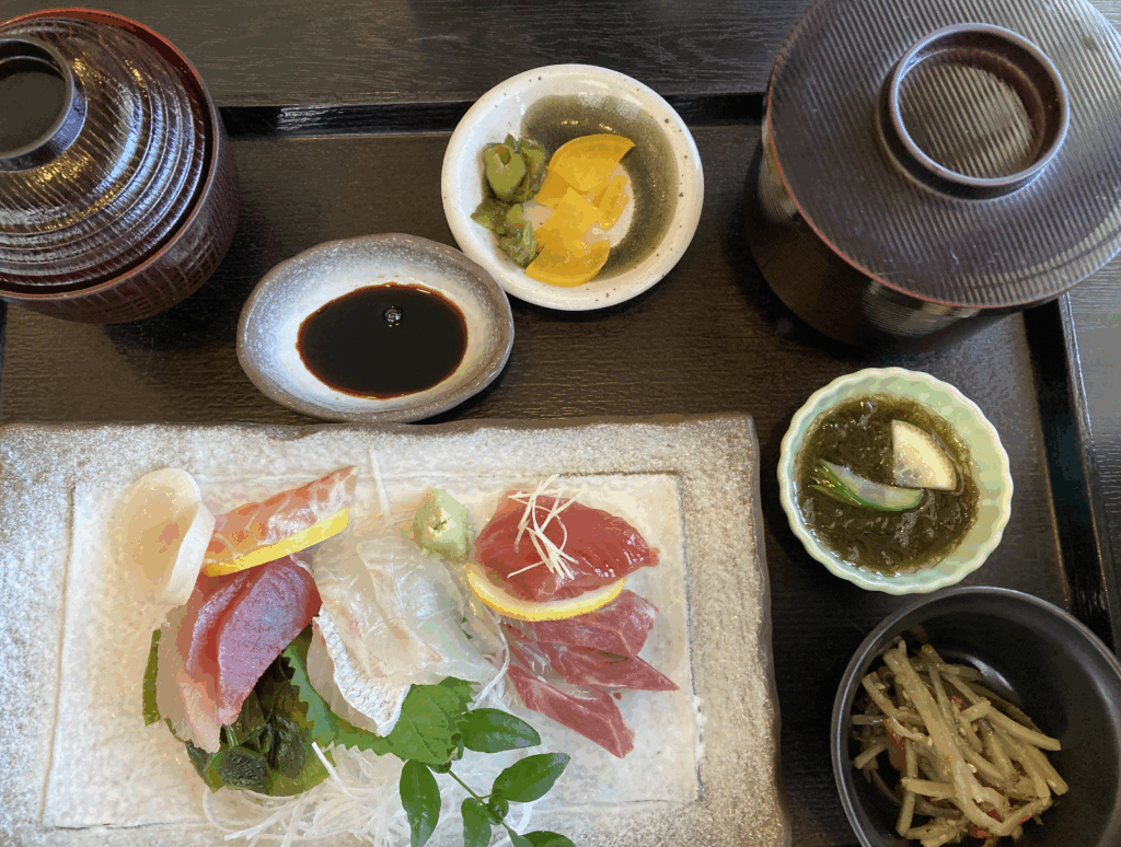 刺身定食は複数の魚種と小鉢が調和。もずくやきんぴらが全体の味のリズムを整える。