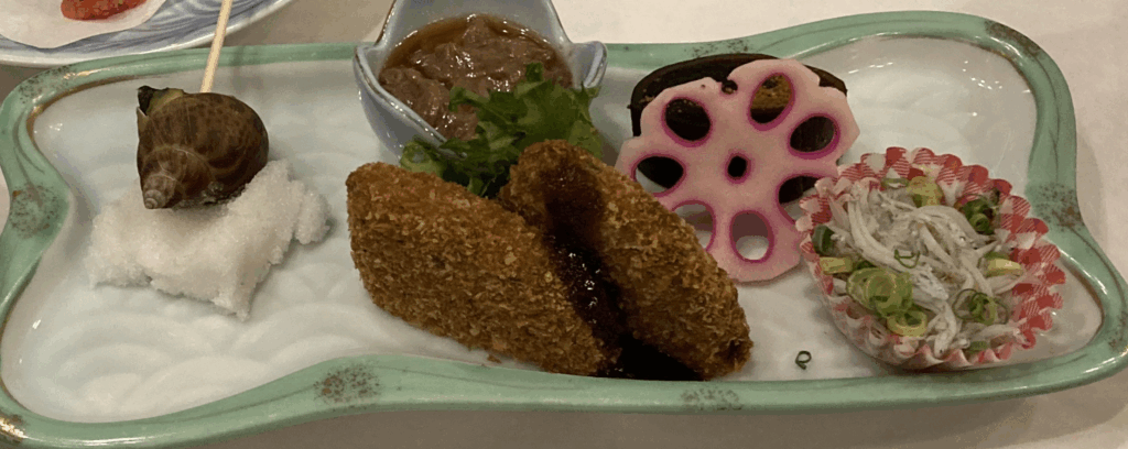 たとえば、しらすを使った和え物やサザエ、地元で作られた酒盗、そして揚げ物など、いずれも素材の持ち味を丁寧に引き出す控えめな味付けでした。