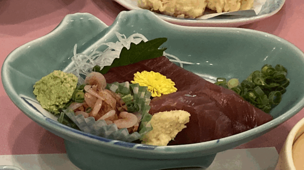 焼津は古くからカツオの水揚げで知られる港町であり、新鮮な白身や桜えび・生しらすといった地元の旬の魚介が揃います。実際に供された刺身は、脂ののったカツオ、そして桜えびの湯引き(あるいはボイル)がアクセントとして加わる構成でした。
