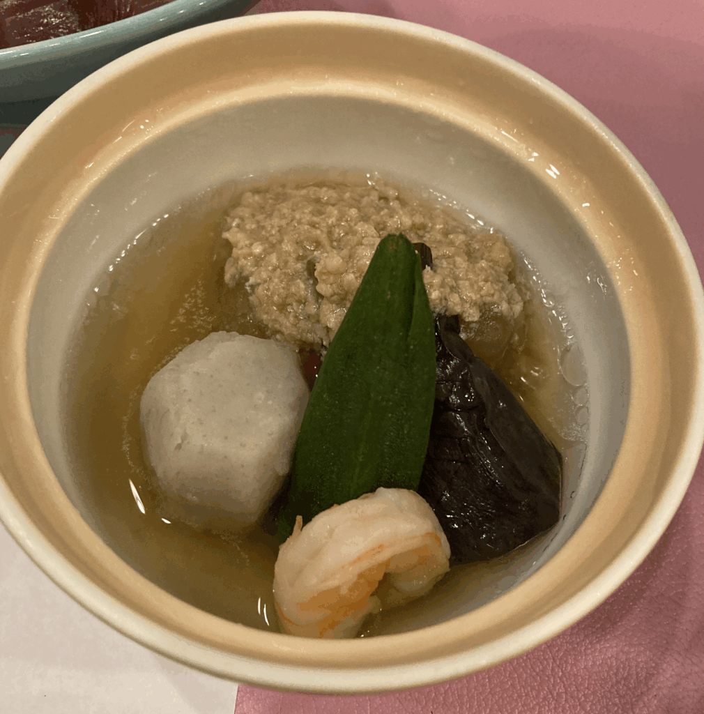 印象に残ったのは、なすの揚げ浸しで、旨みが染み出した汁が、添えられた里芋のやさしい味と調和していました。こうした郷土的な一皿は、同じ食材を多様な火入れで楽しませてくれる点で、旅らしさを感じさせます。