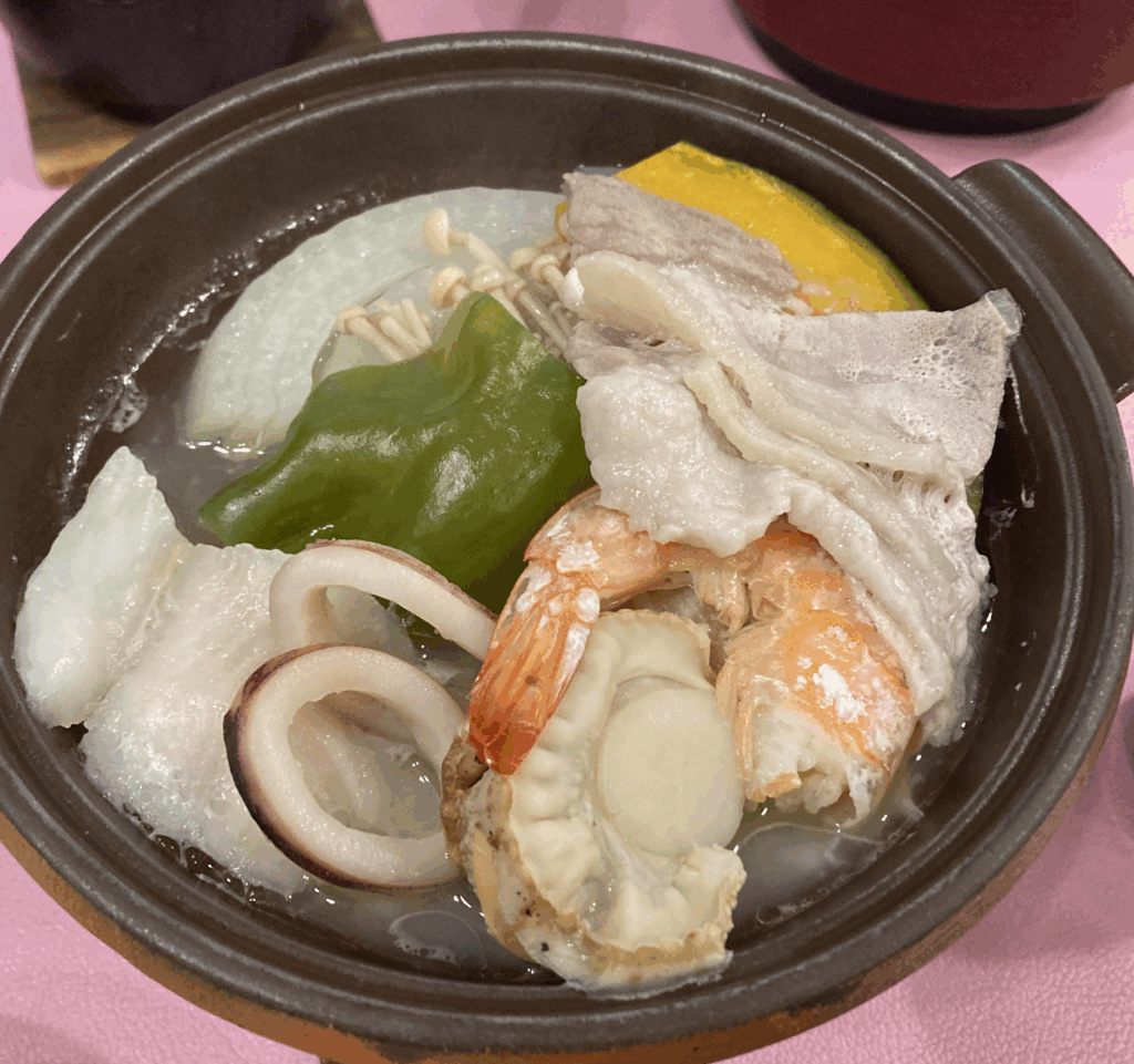 やいづマリンパレスでは、地元の魚介やその出汁を生かした鍋が提供され、これがまた素朴に美味しいのです。ホタテやエビを中心に豚肉や野菜が供され、最後まで「海の余韻」を携えた構成です。