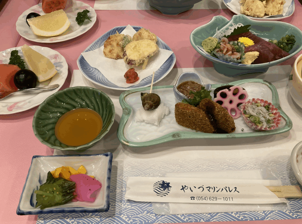やいづマリンパレスでは、宿泊プランに応じて「焼津づくし」などの地元食材を活かした和食膳が提供されることが案内に明記されており、駿河湾で揚がる旬の海の幸が中心に据えられています。今回のも、そうした地元の恵みを丁寧に並べた会席風の構成で供されました。
