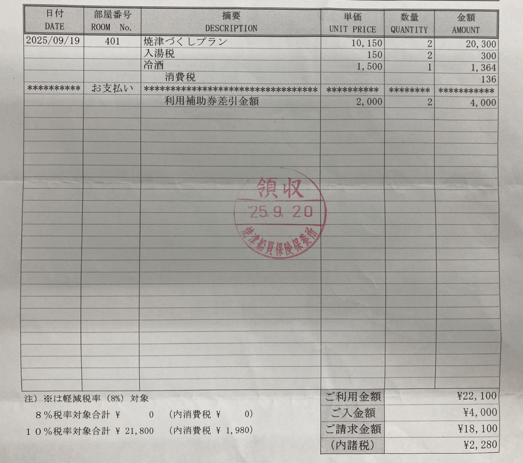 チェックアウトは公式に10:00が基本時間となっており(プランによって異なる場合があるため予約時に確認が必要です)、私たちは余裕をもって部屋を整え、荷物をまとめてフロントに向かいました。フロントの方は手際よく精算・領収の対応をしてくださり、最後まで気持ちよく宿を後にすることができました。