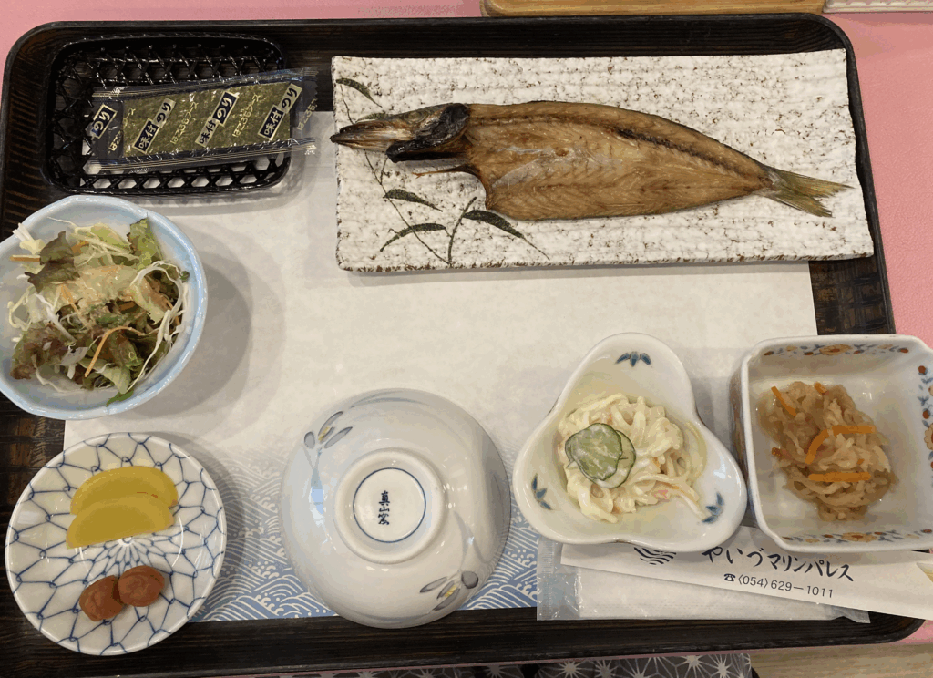 やいづマリンパレスの朝食は和定食での提供が基本となっており、素朴で落ち着いた朝の食卓が用意されます。宿の案内や宿泊者レビューを確認すると、朝食の干物が「アジ」や「サバ」など焼き魚中心で提供されることが多い旨が複数の宿泊者レビューで挙がっており、今回はアジの開きが中心に据えられた、まさに焼津らしい“海の朝ごはん”をいただきました。