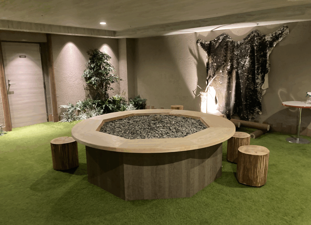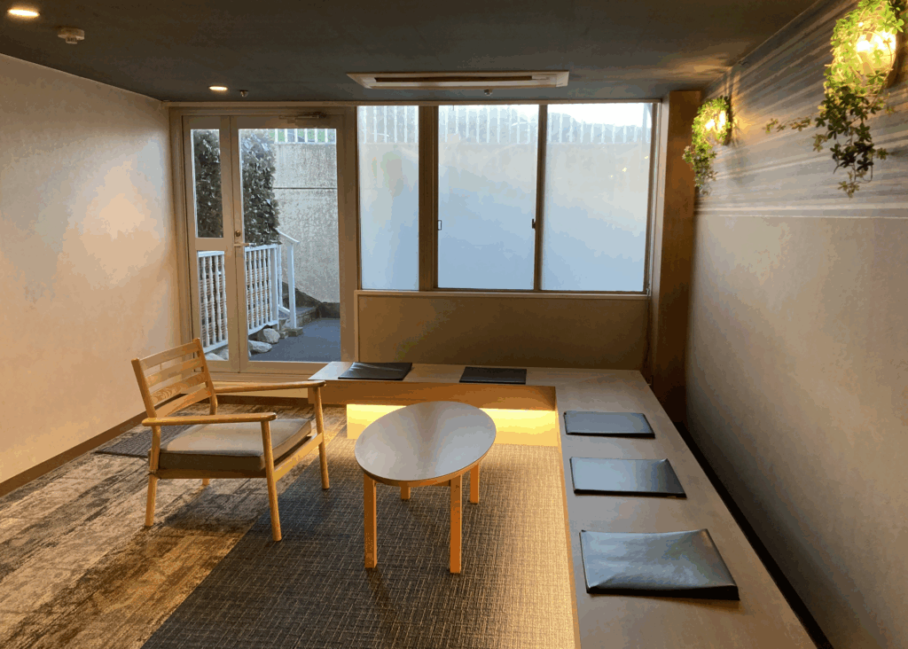 ここは宿泊中であれば滞在時間中いつでも利用できるスペースで、ソファやテーブル、マッサージチェア、そして屋外テラスへの導線が整っています。