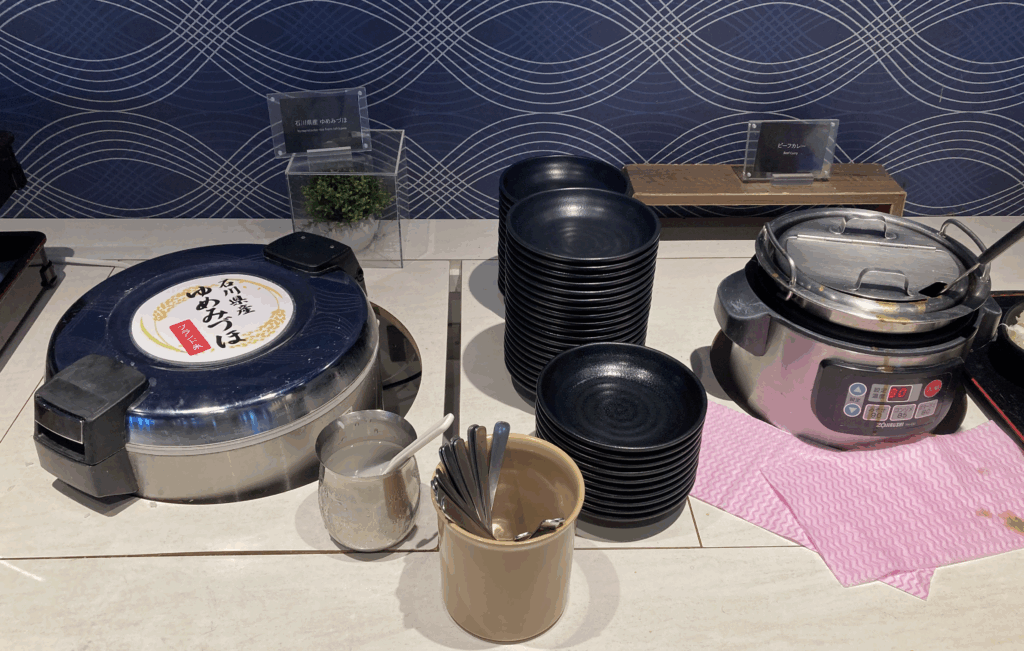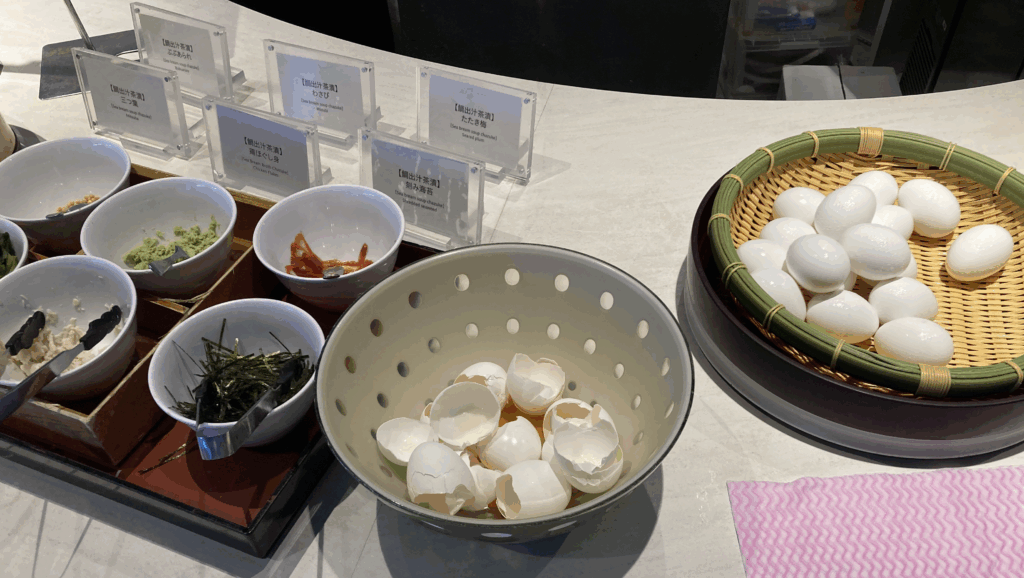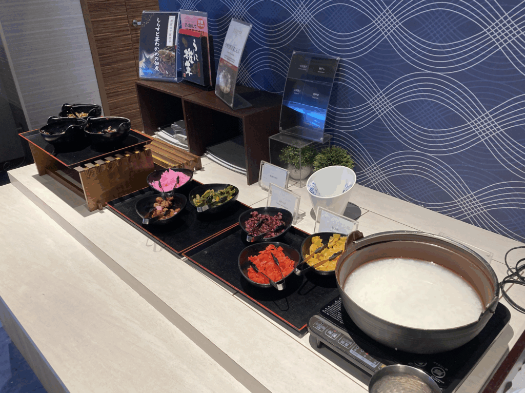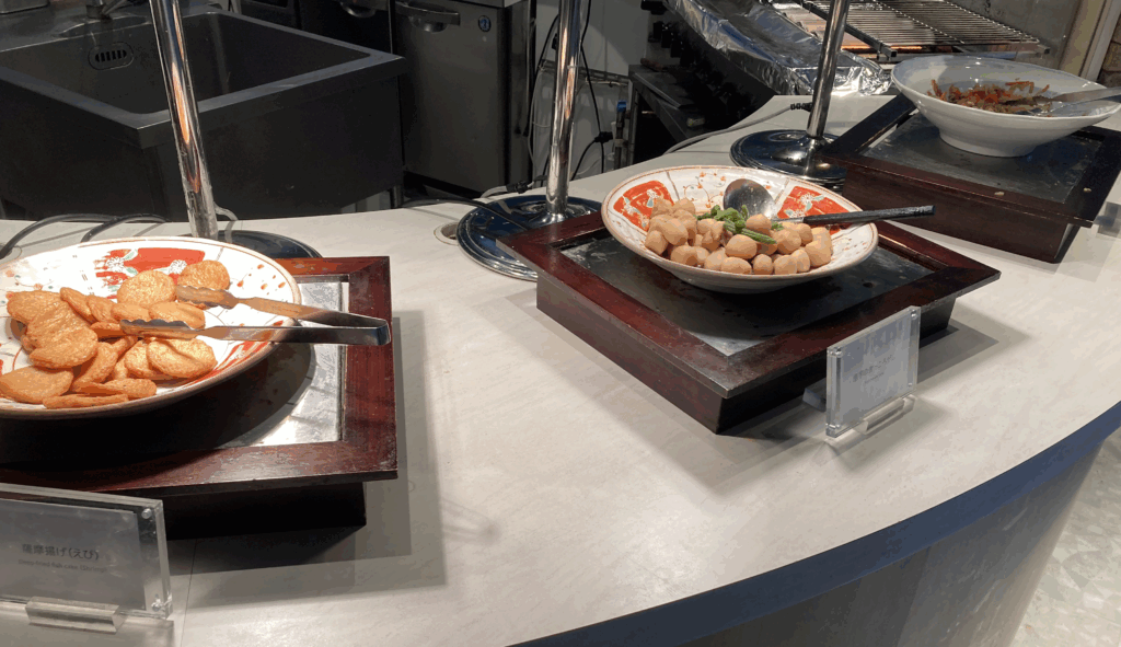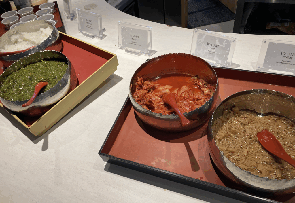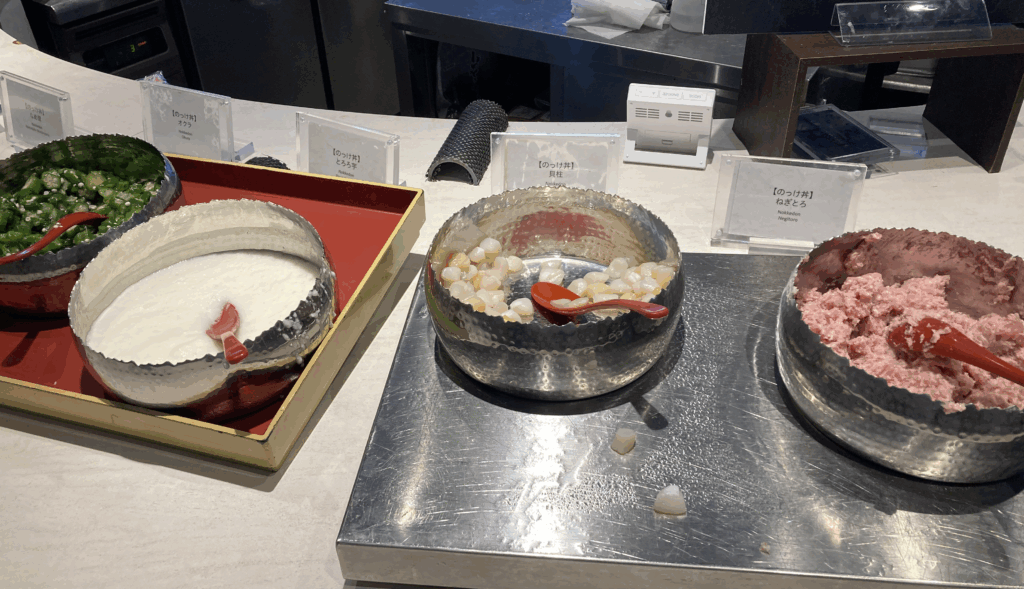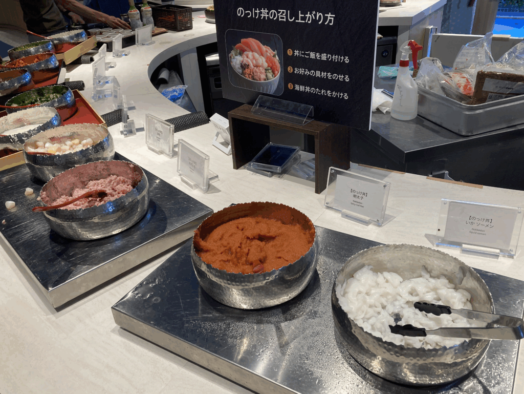 - 海鮮のっけ丼コーナー(具材多数:まぐろ・貝柱・ねぎとろ・やりいか・甘えび・かにかまフレーク・鶏そぼろ・明太子・キムチ・なめ茸・オクラ・めかぶ・とろろ・大根おろし など)。