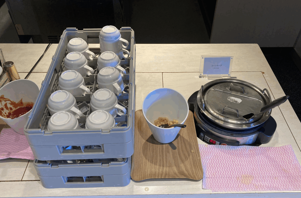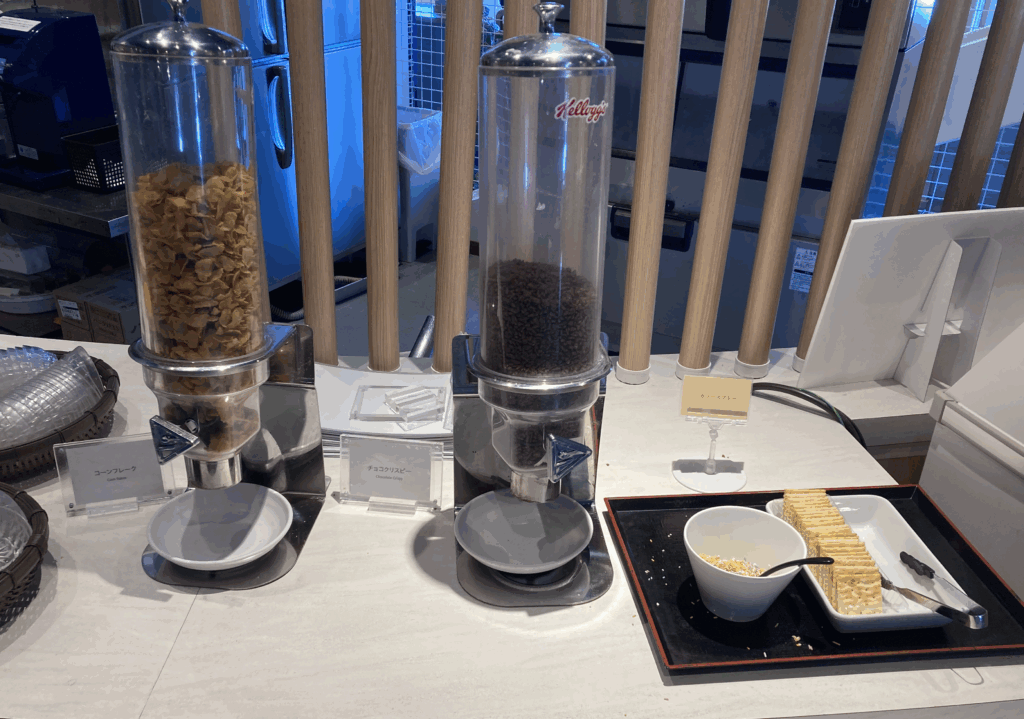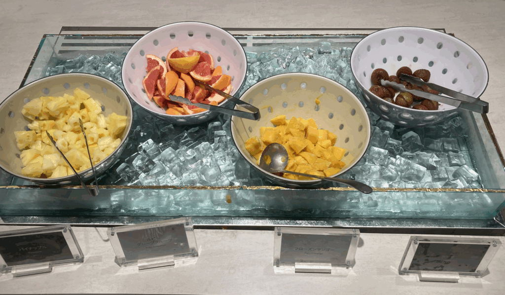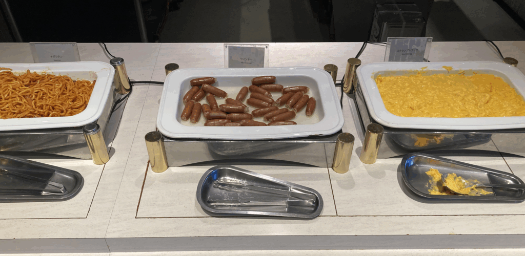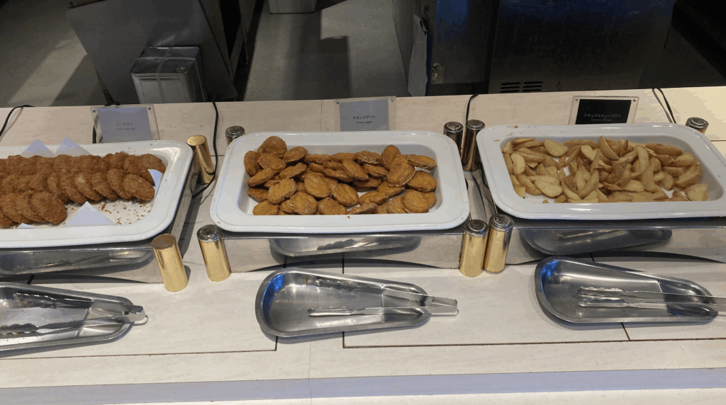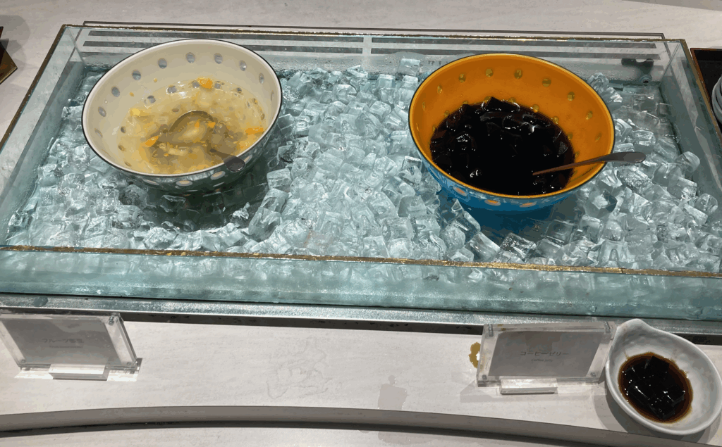 - デザートコーナー(季節のゼリー、ケーキ類)・アイス(ハーゲンダッツ等が並ぶことも)。