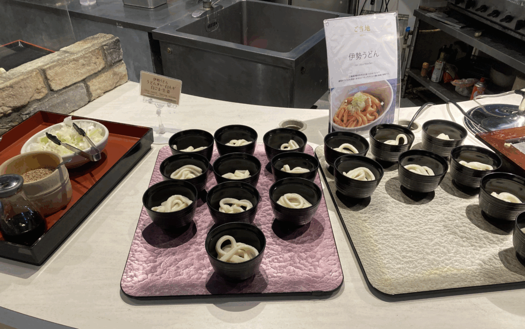 朝食はビュッフェ形式で、のっけ丼・伊勢うどん・フレンチトーストなどご当地メニューが目玉です(季節・仕入れ状況で内容は変わります)。