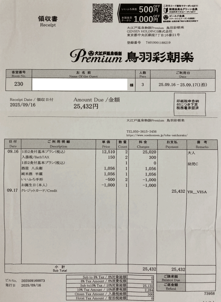 フロントでの手続きはスムーズで、精算や領収書の受け取りも丁寧に対応していただきました。