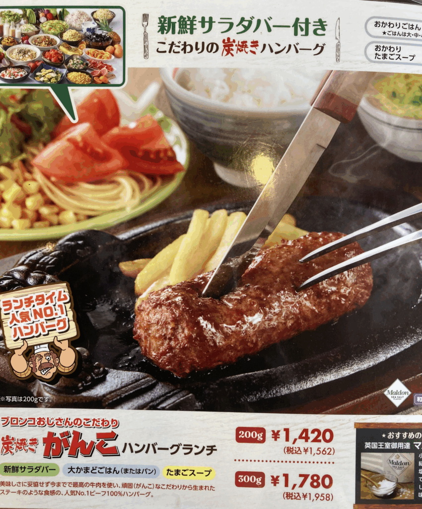 ブロンコビリーのハンバーグは炭火で焼かれた香ばしさがあり、ソースは肉の旨味をしっかり受け止める安定感のある仕上がりでした。