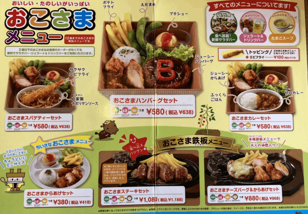 メニューには「おこさまハンバーグセット(580円/税込638円)」「おこさまスパゲティーセット(580円)」「おこさまカレーセット(580円)」のほか、鉄板系のボリュームあるセットや、おこさまステーキなどのラインナップもありました。