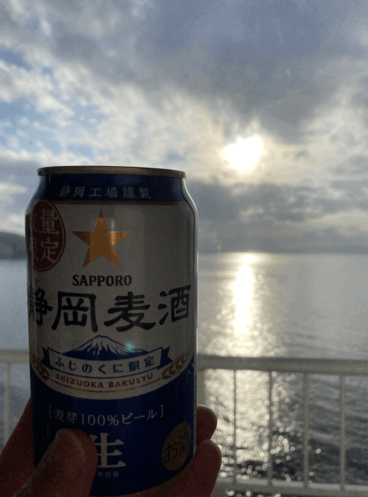 移動で固まった身体をほぐす目的で短めに浸かり、湯上がりには最初の一杯(静岡麦酒)をいただきました。