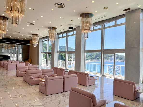 ロビーは大きな窓越しに駿河湾(あるいは南西方向の海域)を望める作り。