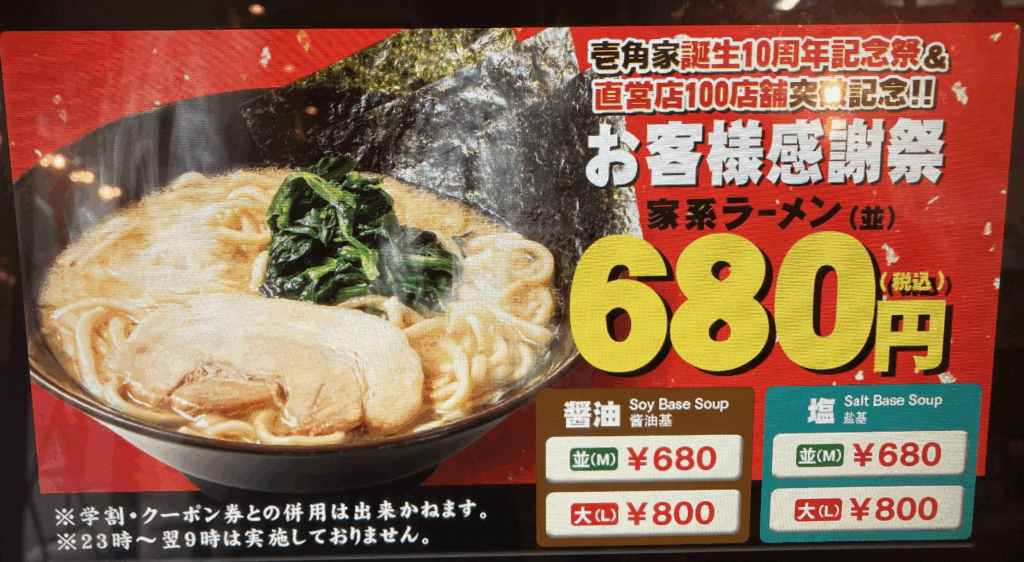 壱角家は時折お得なキャンペーンを打つチェーンとして知られており、来店のタイミングと店舗ごとのサービス条件(ライスの有無など)を押さえておくと、より賢く楽しめます。