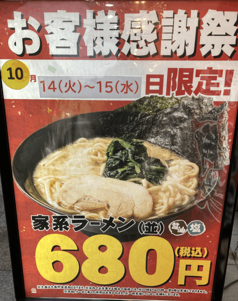※壱角家の公式アナウンスでは、時期ごとに「お客様感謝祭」を複数回実施しており、2025年10月14日〜15日にも一部店舗で開催された案内が出ていました。