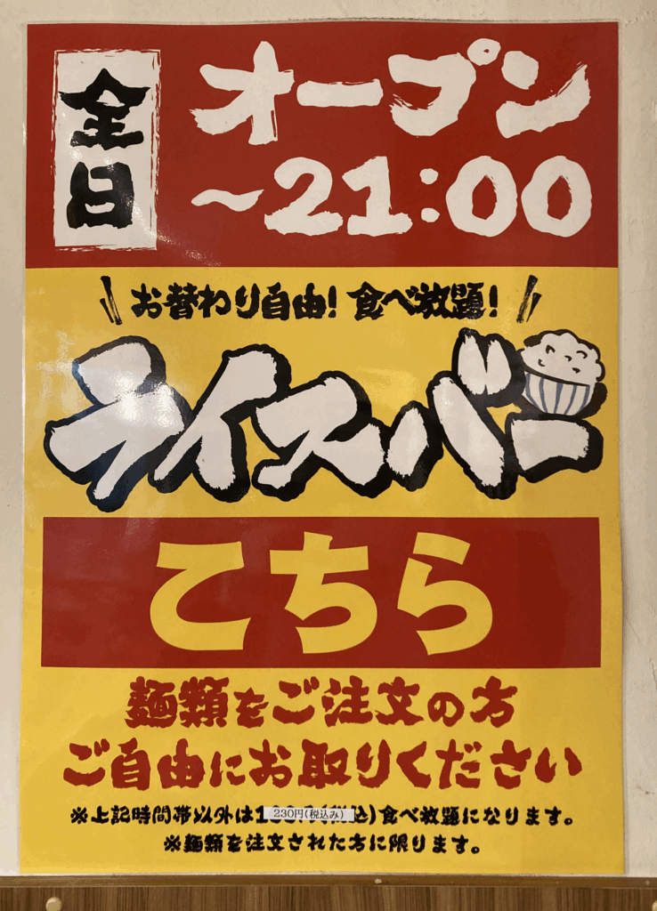この日も「21時まではライス無料(※店舗による)」の掲示が。