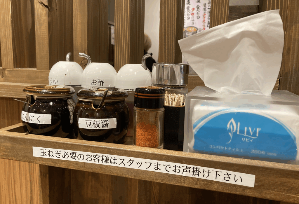 - 〆の雑炊を楽しむなら、麺を食べきる前にライスのおかわりして、卓上の生姜・にんにく・豆板醤・そして注文の玉ねぎを用意しておくとより美味しい。