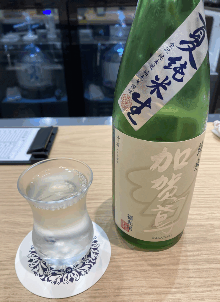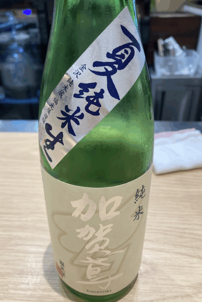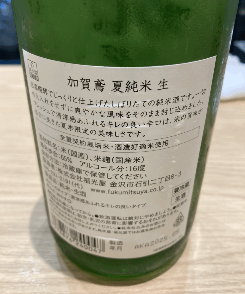 今回の一杯は、加賀鳶 夏純米生。会計は600円。値段の潔さも立ち飲みならではだ。