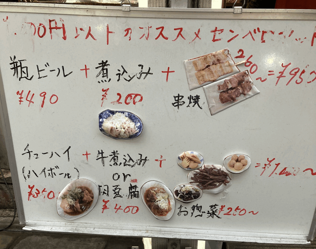 今回撮影した看板では、おすすめのせんべろセットは瓶ビール+煮込み+串焼きという趣旨で案内されていました。