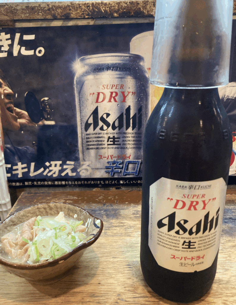 今回は看板で紹介されているせんべろセットの雰囲気を確認しつつ、私が実際に注文した一杯(瓶ビール)と定番の煮込みについて、短い滞在時間で味わってまいりました。