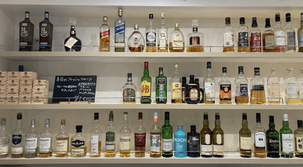カウンター席をひとつ確保すると、目の前に並ぶウイスキーの瓶群がまず目に入ります。照明は明るく、ボトルラベルが横並びに“展示”されている様はまさに“お酒の美術館”という趣向。