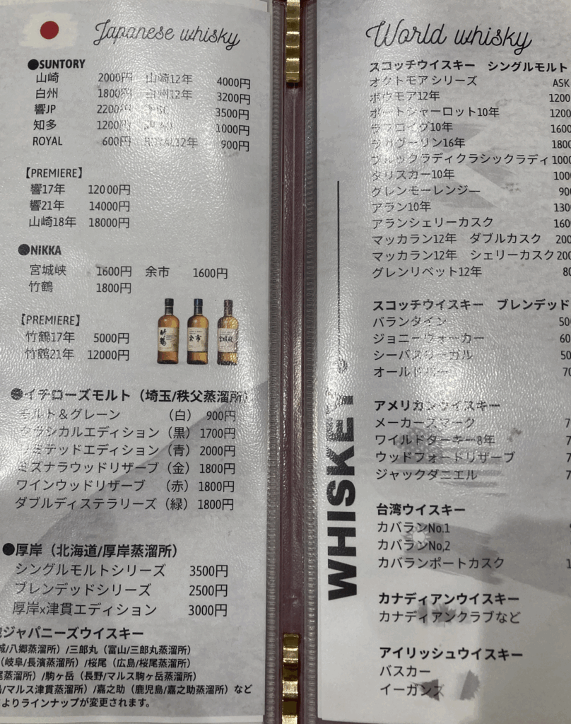 実際、メニューや棚には厚岸ウイスキーの表記や、かつて市場から消えた「響」「竹鶴」など“入手困難”な銘柄が並ぶことをうかがわせる表記がありました(お店の方に確認すると「仕入れで珍しいボトルが入ることがある」とのこと)。