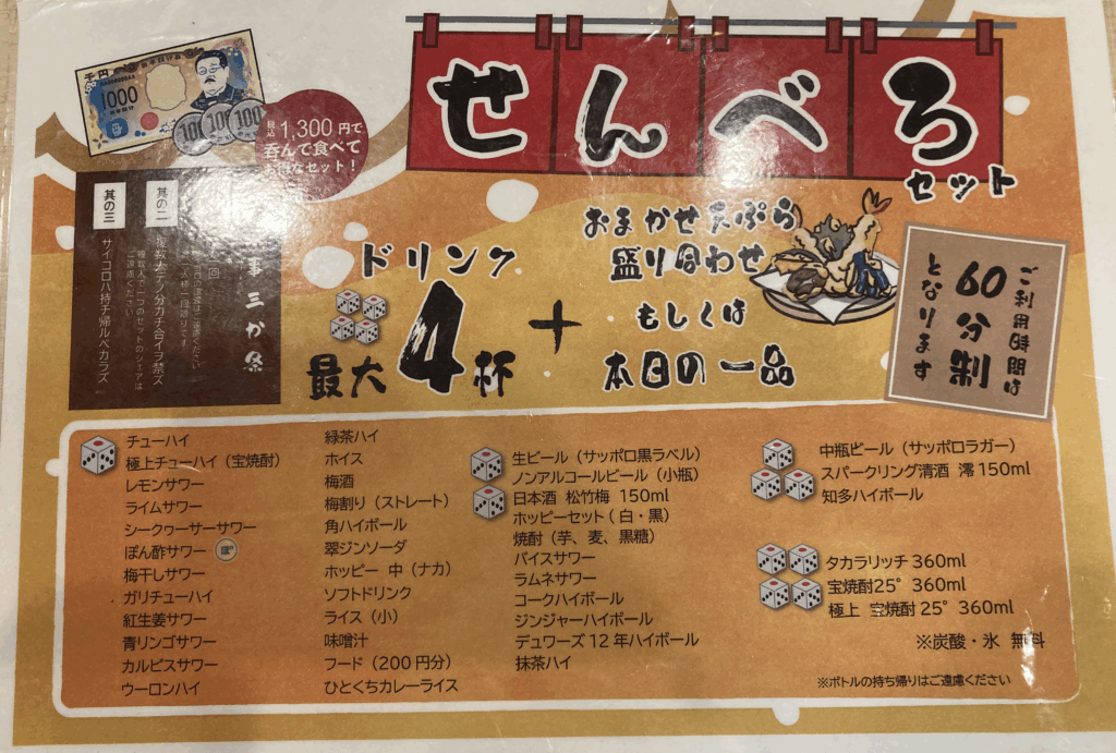メニュー表:せんべろセットの内容とドリンク交換に使うサイコロのルールが書かれています。