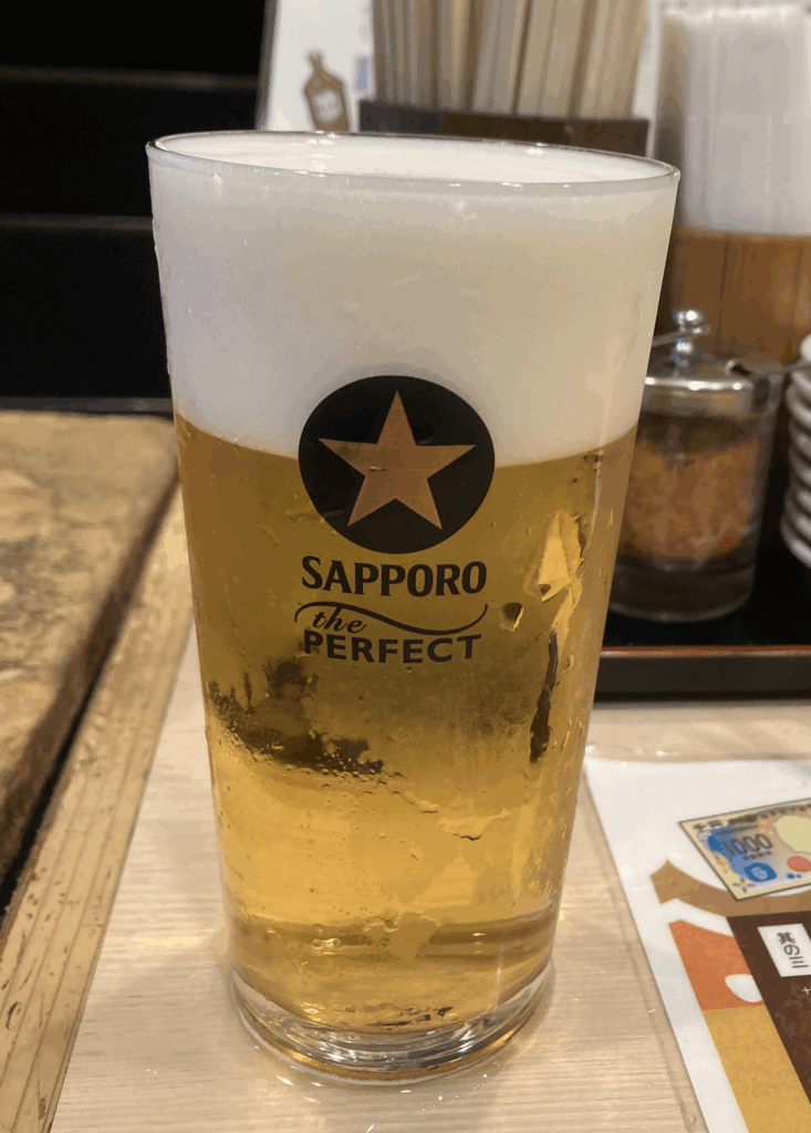 サッポロ黒ラベル(The Perfect)のグラス:きめ細かい泡とクリアな液面が印象的。天ぷらとの相性は抜群でした。