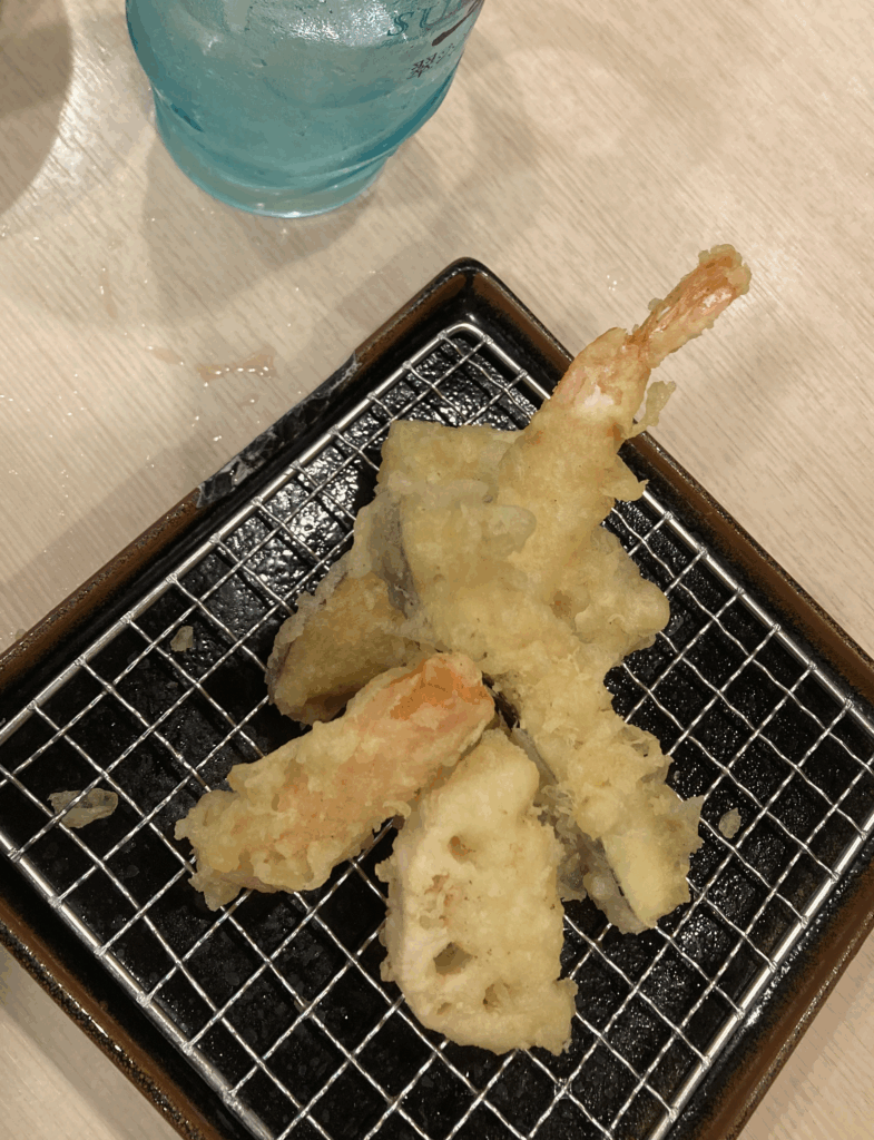 海老・季節の野菜などがバランスよく盛られており、ビールやジンソーダと交互にいただくと、油の余韻が次の口でさっぱりと流れていきます。