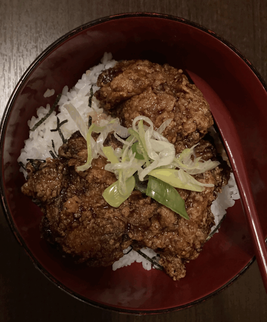 唐揚げを丼に盛り、タレまたは塩だれで軽くまとめた一杯。