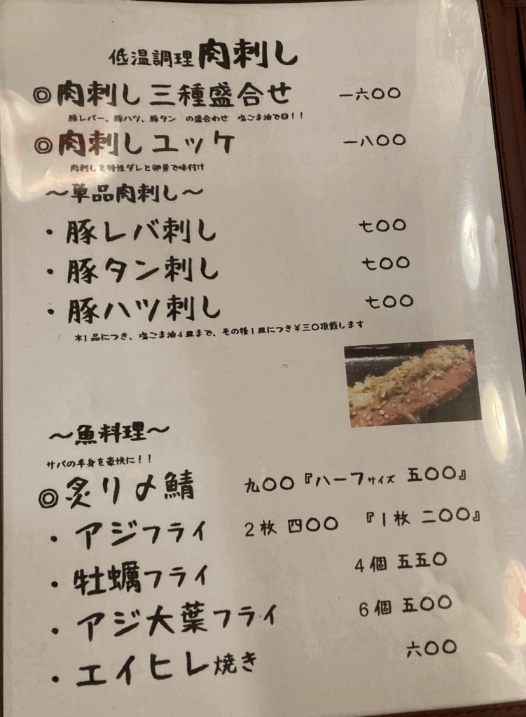 店のメニュー:ちょい呑みセットの肉刺しはレバ・タン・ハツから選択。