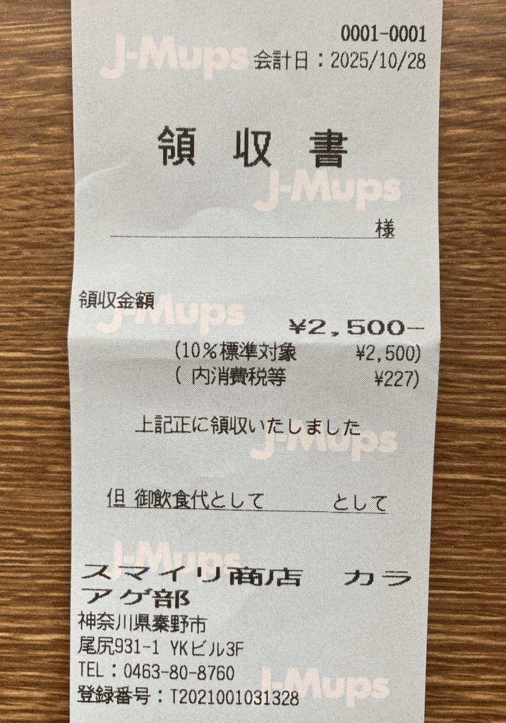 追加オーダー分(ビール2杯、唐揚げ丼、カキフライ)で合計2,500円を支払い。