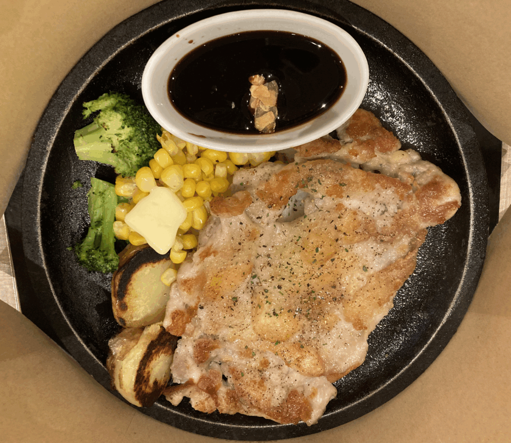 感覚的には「外側の香ばしさ」と「内側のジューシーさ」の対比が心地よく、付け合わせのコーンとブロッコリー、焼きジャガイモが味のリズムを整えます。特に焼きジャガイモの表面の焦げがソースとよく合い、口の中で食感のアクセントになります。