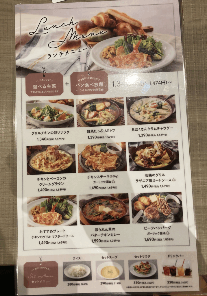 - 多くの店舗で「メイン料理+パン食べ放題 or ライスお替わり自由」がランチ価格に含まれている、もしくはオプションで付けられる。