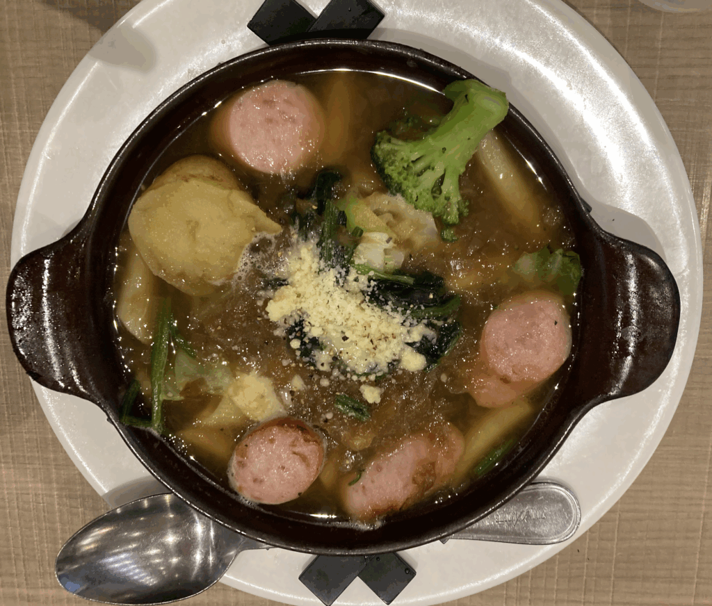 ニンジン、ジャガイモ、ブロッコリーに加え、ソーセージが複数切れ入っており、旨味とコクがスープに溶け込んでいます。スープは澄んでいながらも出汁の深みがあり、塩気は優しめ。寒い日にじんわり温まりたいタイプの仕上がりです。