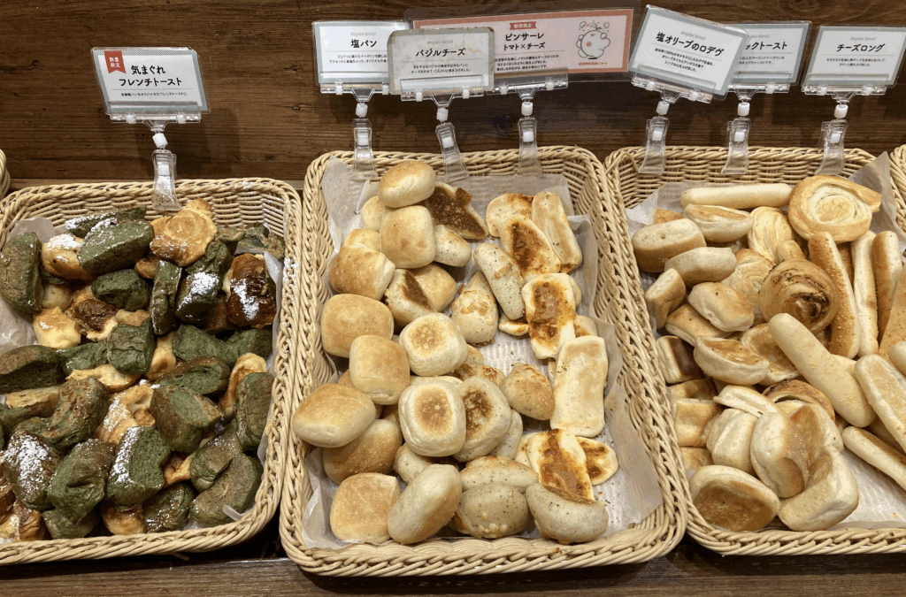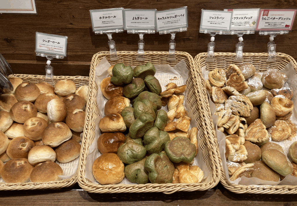 - ショコラフルーツブレッド、よもぎロール、シュガーロール、塩パン、ガーリックロール、チーズロング、バジルチーズ、ミニクロワッサン、ミルクロール、ラー油マヨスティック(季節限定)など。