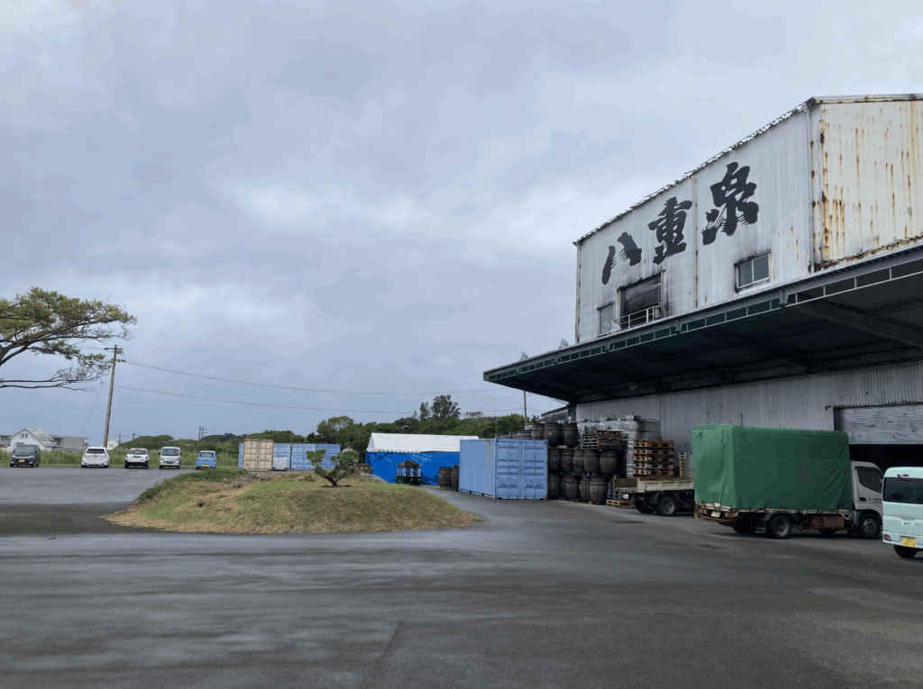 「八重泉酒造の門前。石垣の風を受ける蔵の外観。」